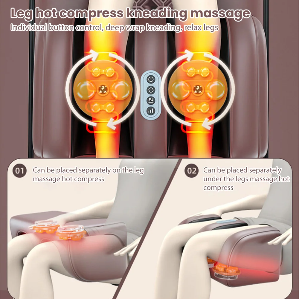 Masseurs détachables pour le cou et les pieds** Profitez d’un massage profond **du cou** avec **2 têtes de pétrissage et 20 nœuds** pour soulager la raideur et la tension. Le **masseur de pieds** dispose de **32 nœuds** pour un massage complet du pied, du mollet ou des cuisses. Ajustez la direction de pétrissage, les niveaux de +3 vitesses** et la **fonction chauffage** selon vos besoins. Les deux masseurs sont **amovibles** pour plus de commodité.